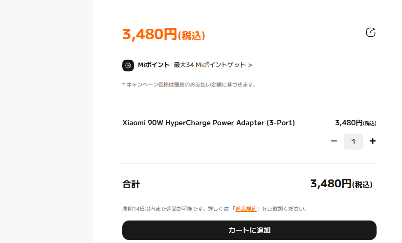 それでいて価格は67Wより安い3,480円!(ケーブルは別売、Xiaomiの独自充電はケーブル対応も必要です)