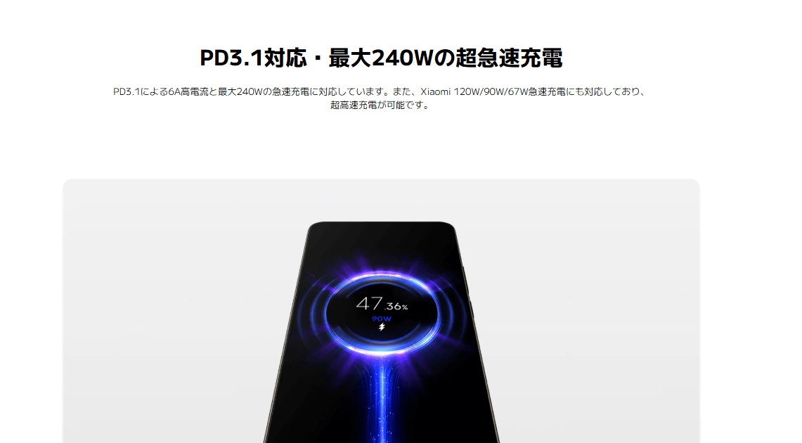 まず90Wの高出力に対応しています。今まではXiaomi 14 UltraやPOCO F7等比較的高めの機種の付属品経由でしか入手できなかったが、これからは単品で買うことができます。